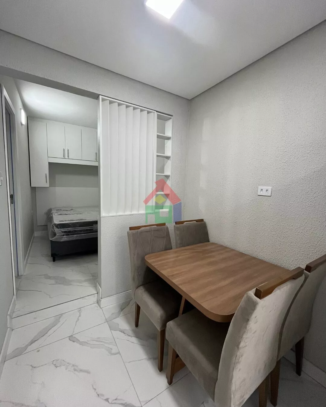 Studio totalmente novo e já mobiliado com geladeira, fogão por indução e cama de casal com colchão. Tudo pensado para você chegar e morar sem preocupação. ✨