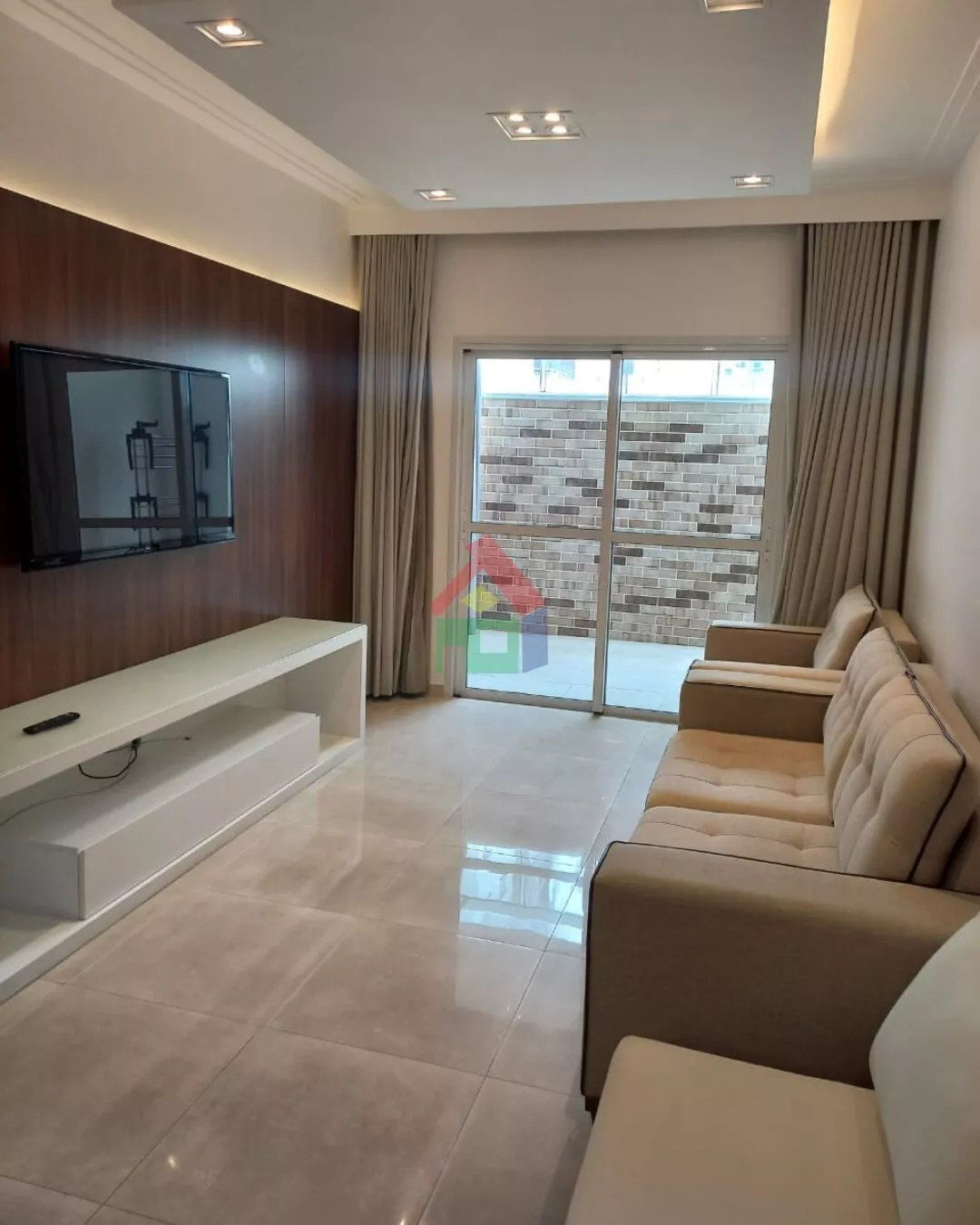 sofás, poltrona, cama de casal, mesa de jantar, TV, geladeira, cooktop, micro-ondas, forno, exaustor, cortinas e chuveiros